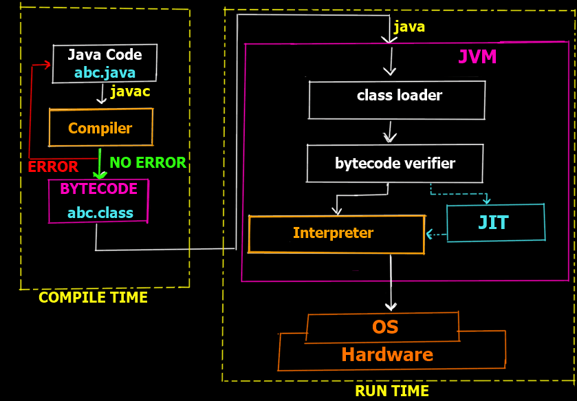 7. Code Execution: After compilation, the code becomes bytecode. When you run it with the Java command, specifying the class name, the JVM executes it.